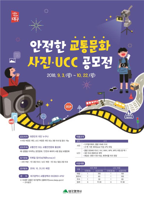 공모전은 9월 3일(월)~ 10월 22일(월)까지 교통안전 또는 교통안전문화 활성화를 주제(생명을 지켜주는 운전문화, 안전과 배려의 사람 중심 보행문화 등)로 사진 및 UCC 2개 부문으로 나누어 공모한다. 참가자격은 대한민국 국민이면 누구나 이메일(ldj79@korea.kr)로 참여할 수 있으며, 공고 내용 및 기타 자세한 내용은 대구시 홈페이지(www.daegu.go.kr/고시공고)에서 확인할 수 있다.
