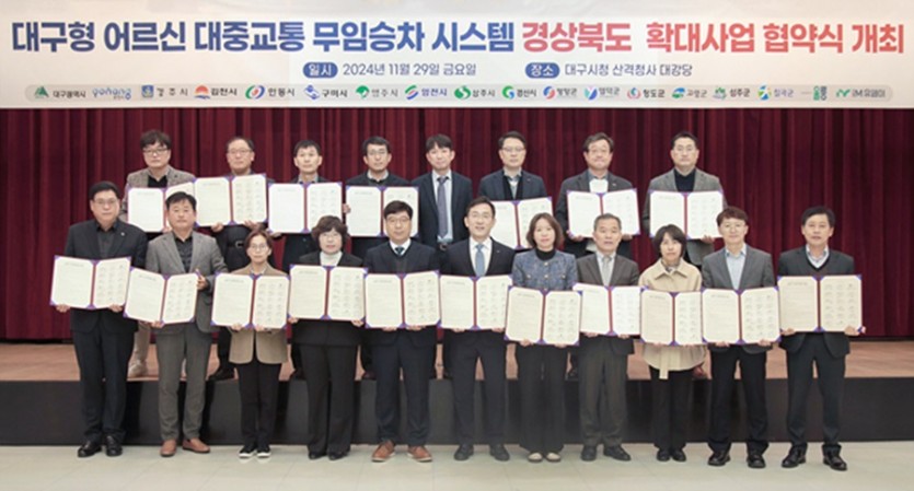 대구시는 지난달 29일 산격청사 대강당에서 경북도 포항시와 경주시를 비롯한 16개 기초 지자체와 함께 ‘대구형 어르신 무임승차 시스템’ 확대 구축을 위한 업무협약을 체결했다.