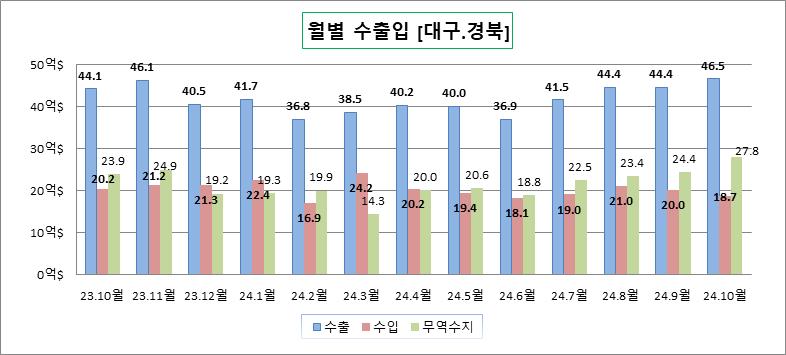 관세청이 발표한 지난달 10월 대구․경북의 수출은 전년 동월 대비 5.4% 증가한 46.5억 달러, 수입은 7.5% 감소한 18.7억 달러로 무역수지는 16.3% 증가한 27.8억 달러 흑자를 기록했다고 15일 밝혔다.