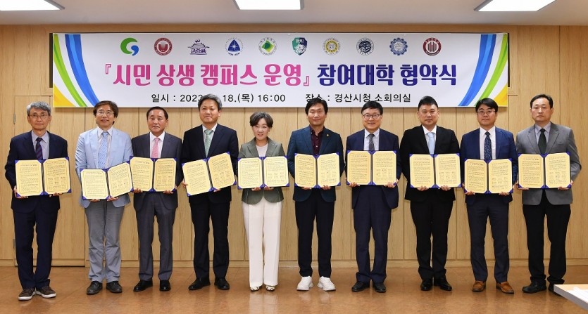 경산시는 18일 관내 9개 대학과 대학·시민이 공유하는 열린 공간 조성과 특별한 평생교육 프로그램 운영을 위한 "시민 상생 캠퍼스 운영"참여대학 협약식을 체결했다고 밝혔다.