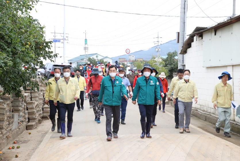 주 시장은 추석연휴 12일 오전 부터 내남 이조‧안심, 불국 진티마을, 문무대왕 호암‧용동, 암곡 왕산마을 등의 주택‧상가 침수 현장, 하천범람 및 제방유실, 비닐하우스 침수현장 등을 차례로 방문했다.