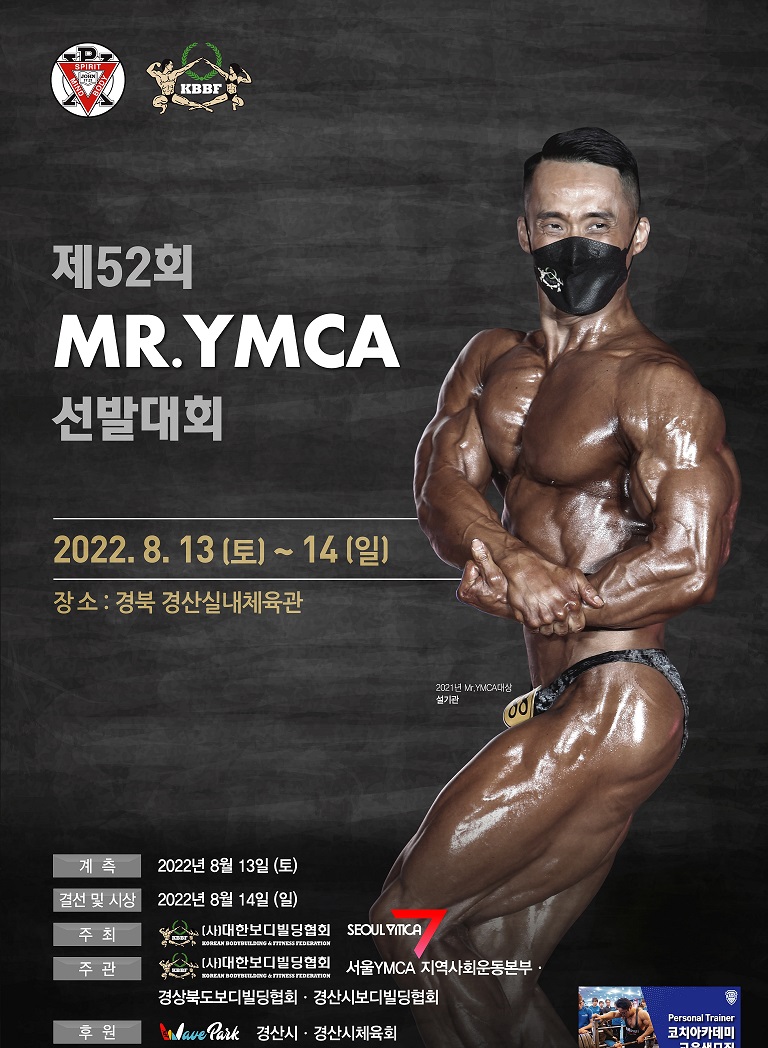 대한보디빌딩협회가 주최하고 서울YMCA 지역사회운동본부와 경북보디빌딩협회, 경산시보디빌딩협회 공동주관으로 경산실내체육관에서 ‘제52회 Mr. YMCA 선발대회’가 열린다.