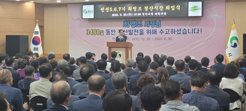 퇴임사에서 최영조 경산시장은 첫 취임 당시 "살기좋은 도시 경산", "행복도시 경산"을 만들겠다는 약속을 지키기 위해 끊임없이 노력해온 시간을 회고하며 그간의 성과를 돌아봤다.