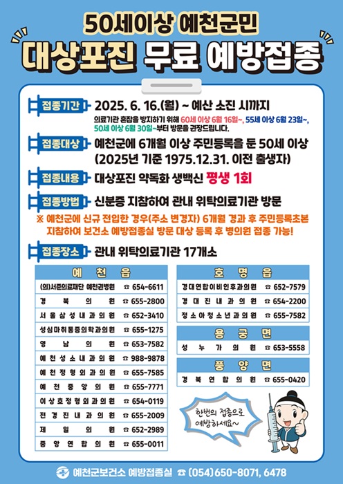 군은 이날부터 50세 이상 군민을 대상으로 대상포진 무료 예방접종을 확대 시행하며 기존 65세 이상이던 지원 대상을 50세 이상으로 넓혀 예산 소진 시까지 추진하며, 예천군에 6개월 이상 주소를 둔 주민이 대상이다.