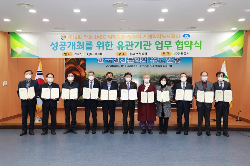 안동시는 3일 시청 청백실에서 '제16회 안동 국제교육도시연합(IAEC)세계총회'와 '제18회 세계역사도시회의'의 성공 개최를 위해 유관기관 간 업무협약식을 개최했다.