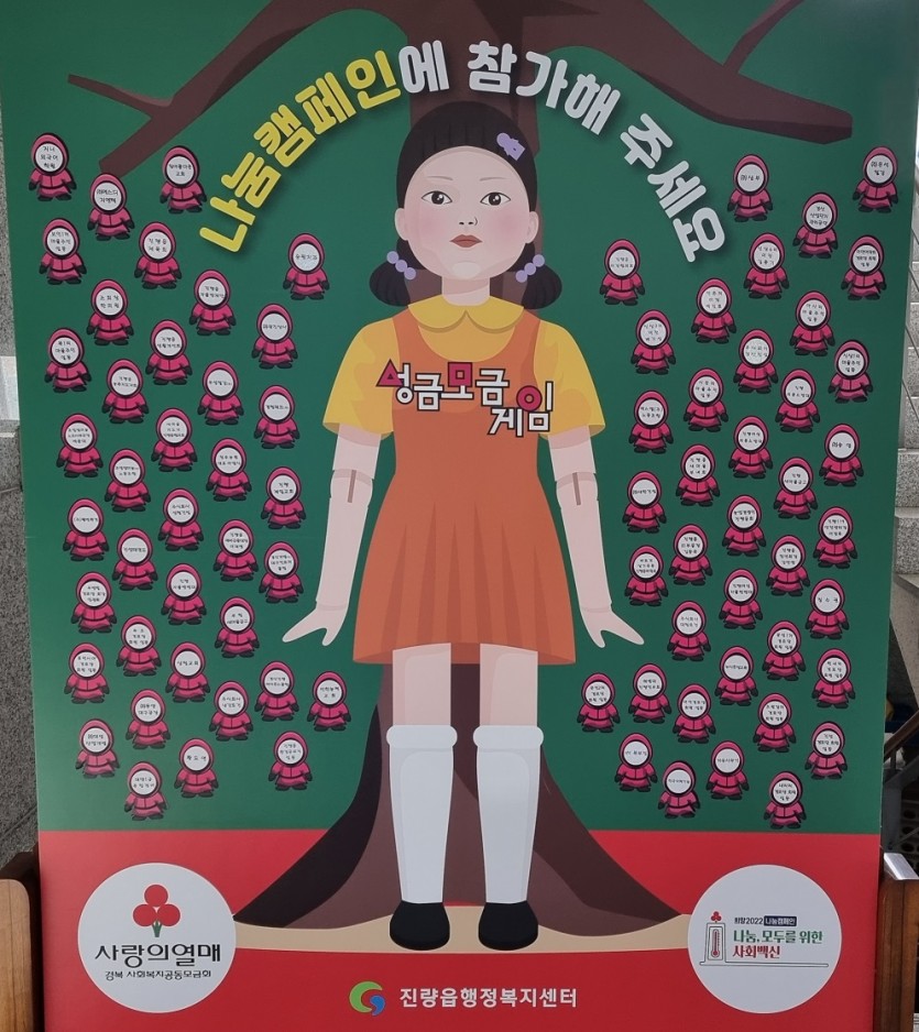 한편 진량읍은 캠페인 동안 ‘오징어게임’을 패러디해 설치한‘성금모금게시판’에 기부자의 이름을 부착하여 지역민들에게 나눔을 알리고 선순환을 만드는 홍보활동을 펼쳐 기부문화 확산을 독려했으며, 모금된 성금은 지역 내 저소득 가정 등 취약계층 이웃을 위해 쓰이게 될 예정이다.