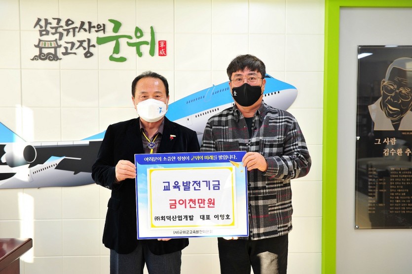 ㈜회덕산업개발 이영호 대표는 6일 군위군청을 방문해 지역의 교육발전과 인재양성을 위한 교육발전기금 2,000만원을 기탁했다.
