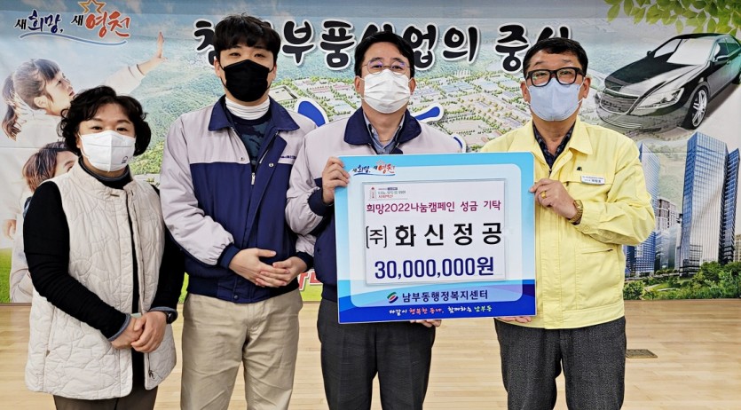 ㈜화신정공(대표 정서진)은 지난 17일 영천시 남부동 행정복지센터를 방문해 ‘희망2022 나눔캠페인’ 성금으로 3,000만원을 기탁했다.
