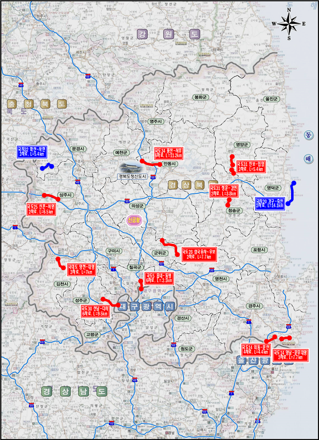 급곡선․급경사 등 사고 위험구간에 대한 시설개량사업으로는 청송 진보~영양 입암간 국도31호선 2차로 개량 5.40km 총사업비 920억원, 경주 양남~문무대왕 국도14호선 2차로 개량 7.7km 총사업비 669억원, 상주 내서 신촌~서원간 국도25호선 2차로 개량 6.50km 총사업비 484억원, 군위 삼국유사~우보간 국도28호선 2차로 개량 7.7km 총사업비 412억원, 청송 청운~부남 감연간 국도31호선 2차로 개량 3.8km 총사업비 328억원, 영덕 강구~축산간 국지도20호선 2차로 개량 14.1km 총사업비 1101억원, 문경 농암 화산~사현간 국지도32호선 2차로 개량 5.4km 총사업비 427억 원이다