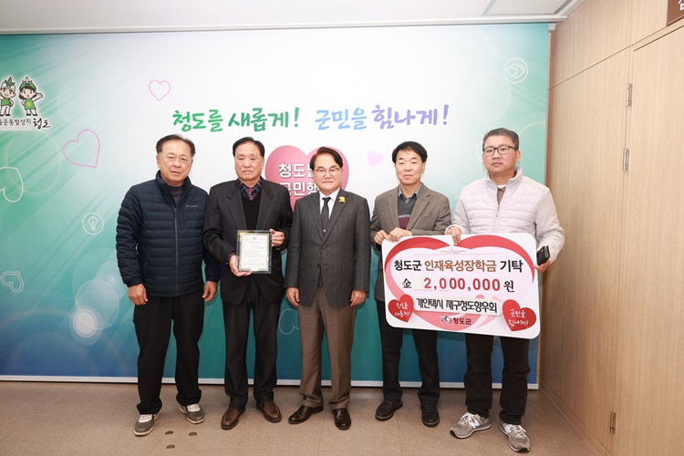 청도군은 26일 재구개인택시청도향우회(회장 이상국)에서 청도군 인재육성장학회에 장학금 200만 원을 기탁해 고향 발전과 인재육성에 힘을 보탰다고 밝혔다.