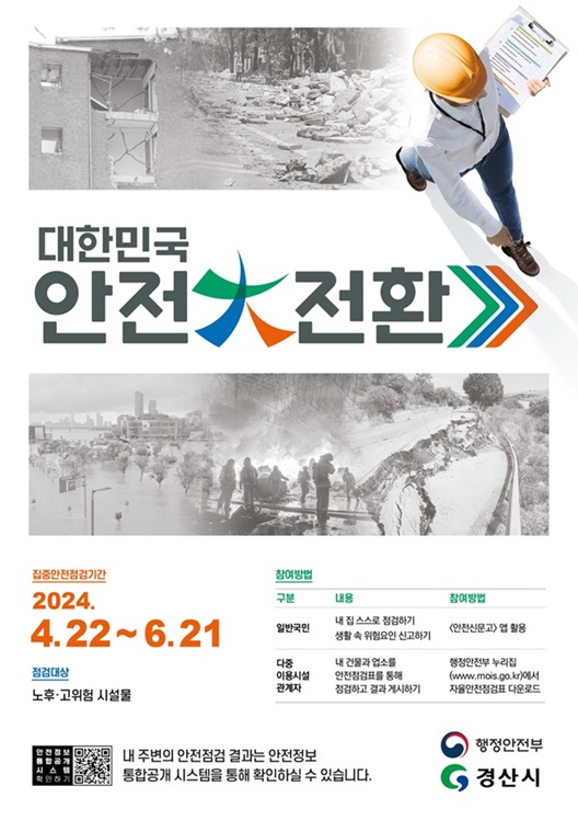 경산시는 22일부터 6월 21일까지 범국가적 재난 사전 예방 활동인 대한민국 안전대(大)전환을 추진하고 있다고 밝혔다.
