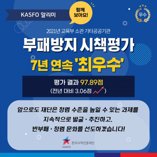 이번 평가에서 KASFO는 97.89점으로 높은 점수를 받았으며, 평가가 처음으로 시행된 2015년부터 7년 연속 93점 이상의 평가 결과를 유지하고 있다.