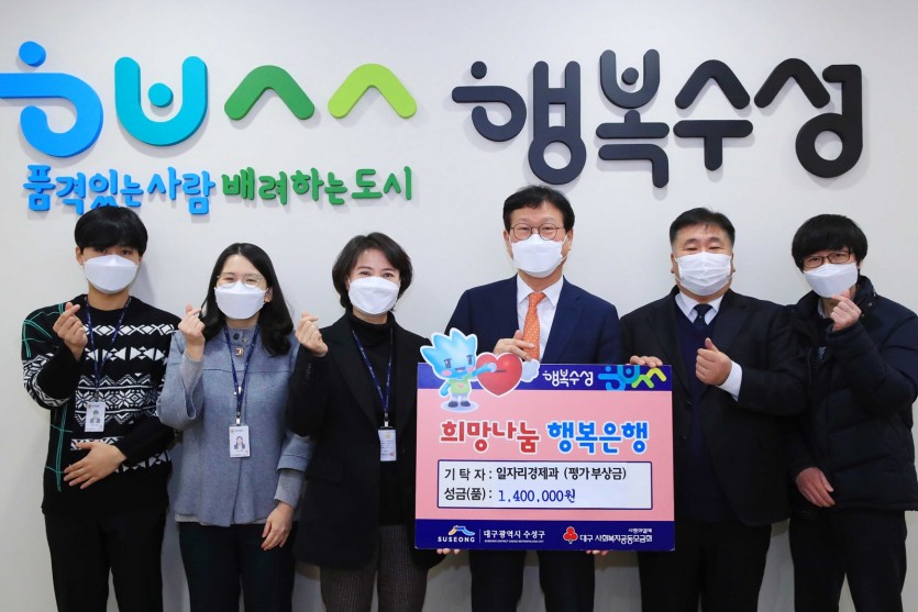 대구 수성구는 지난 18일 어려운 이웃을 위해 써달라며 ‘2020년 공공분야 일자리사업평가’ 포상금 140만원을 대구사회복지공동모금회에 전달했다.