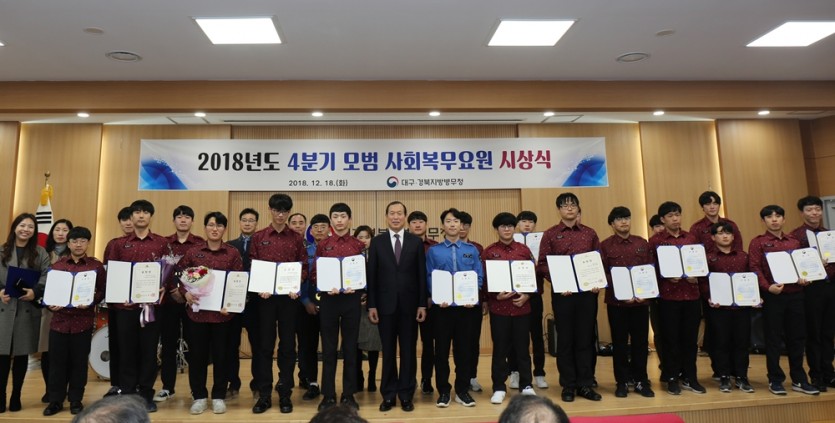 대구·경북지방병무청은 지난 18일 모범 사회복무요원과 복무관리 업무유공 직원을 발굴·포상해 사기진작 및 근무의욕을 고취하기 위해 모범사회복무요원 표창 시상식을 청사 6층 대강당에서 개최했다.