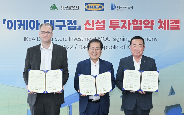 대구시는 28일 산격동 청사에서 홍준표 대구시장, 정명섭 대구도시공사 사장이 참석한 가운데 이케아코리아(유)(대표 프레드릭 요한손)와 이케아 대구점 건립을 위한 투자협약을 체결했다고 밝혔다.