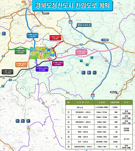 도청신도시 진입도로는 상위 국가기관 교통망과 연계구축을 위해 8개노선에 1조 2634억 원이 투입되는 사업이며 신도시 동편(안동방면)과 북편(예천방면), 남쪽 편 방향의 진입도로 3개 노선 14.9㎞는 개통을 완료한 상태에서 서편 진입도로 개설 완료로 신도시 개발 10년 만에 사통팔달 교통망을 갖추게 됐다.