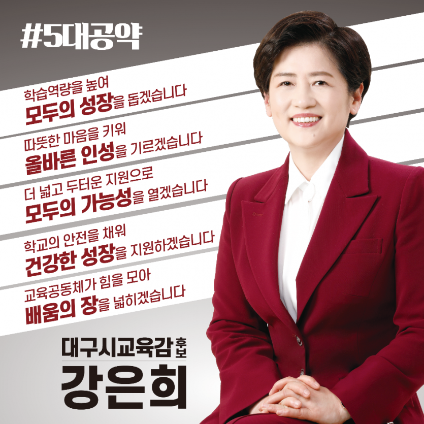 한편, 강은희 대구교육감 후보는 오늘 발표한 5대 공약을 실천하기 위해 ‘아이 중심, 교실 중심 세상을 바꾸는 대구교육’이라는 슬로건을 확정하고 선거 유세를 펼치고 있다.