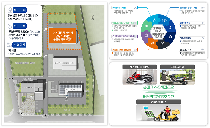 경북테크노파크가 주관하는 "전기이륜차 배터리 공유스테이션 플랫폼 구축사업"은 경주시 구어2일반산업단지 내 ▲전기이륜차 배터리 공유스테이션 통합관제허브센터 구축 ▲안전신뢰성 평가 장비 및 통합관제 장비 9종 구축 ▲배터리 공유스테이션 기술 단체 표준화 제시 ▲시험평가기법 확립 ▲관제DB 구축 등으로 구성돼 있으며, 관련 기업체에 플랫폼 활용 기술 및 사업화를 지원한다.