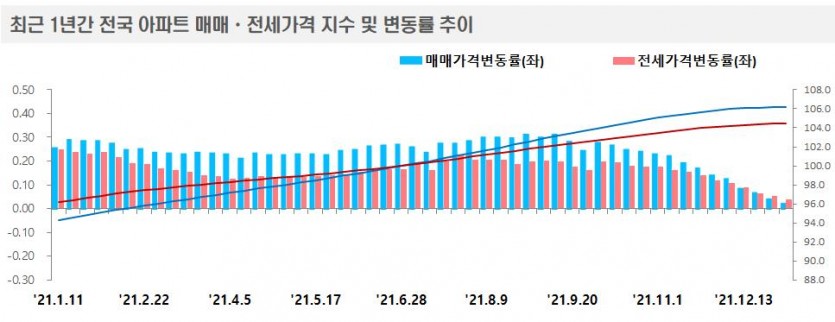 한국부동산원이 1월 1주(1.3일 기준)간 전국 주간 아파트가격 동향을 조사한 결과, 매매가격은 0.03% 전세가격은 0.04% 상승했다고 6일 밝혔다.