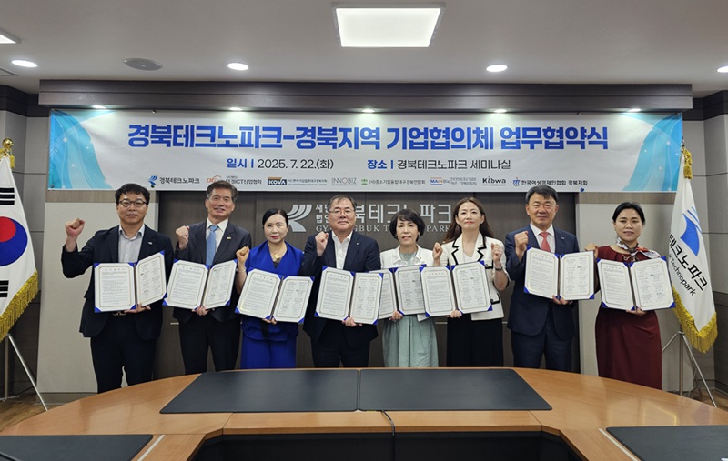 경북테크노파크는 지난 22일, 경북지역 7개 중소기업 협의체와 업무협약을 체결하고, 해외 우수 인재 채용 연계, 글로벌 역량 강화, 해외 박람회·수출상담회·채용설명회 등 공동사업을 추진하기로 했다.