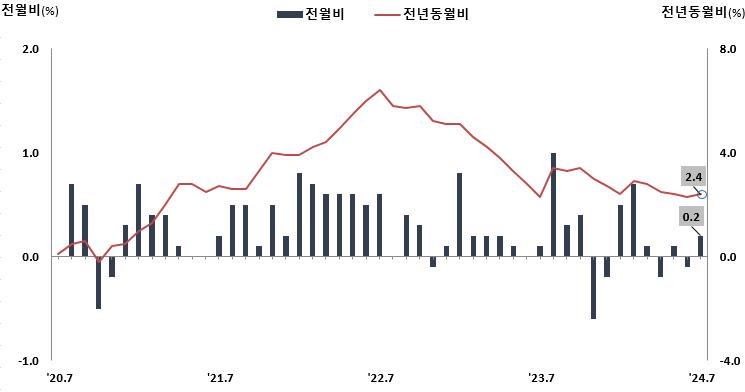 2024년 7월 대구시의 소비자물가지수(CPI)는 114.12(2020년=100)로, 이는 전월 대비 0.2% 상승한 수치로 전년 동월 대비 2.4% 상승하며 전월의 2.3%보다 0.1%포인트 증가했다.