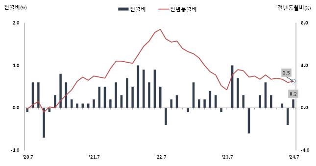 경북도의 7월 소비자물가지수는 114.76(2020년=100)로, 전월 대비 0.2% 상승했으며 전년 동월 대비 2.5% 상승하여 전월 2.4%보다 0.1%포인트 증가했다.