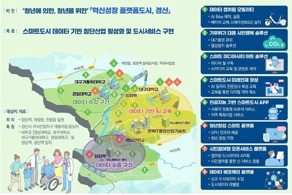 경산시는 청년인구 감소로 인한 지역경제 쇠퇴 문제 해결을 위해 기존 도시 인프라(경산 임당 유니콘파크, 청년지식놀이터 등)를 연계·활용해 데이터 기반 첨단산업 활성화 도시를 조성한다.