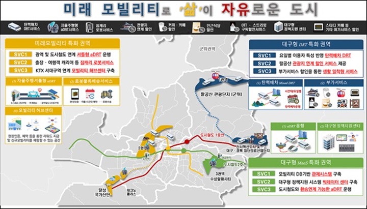 ‘모빌리티 특화도시 조성’ 사업은 국토부와 협약을 통해 자율주행 셔틀 운행(서대구KTX역~서부정류장역)과 수요응답형 대중교통 및 로봇 운송서비스를 일상에서 구현함으로써 첨단 모빌리티에 대한 시민 체험 기회를 제공한다.