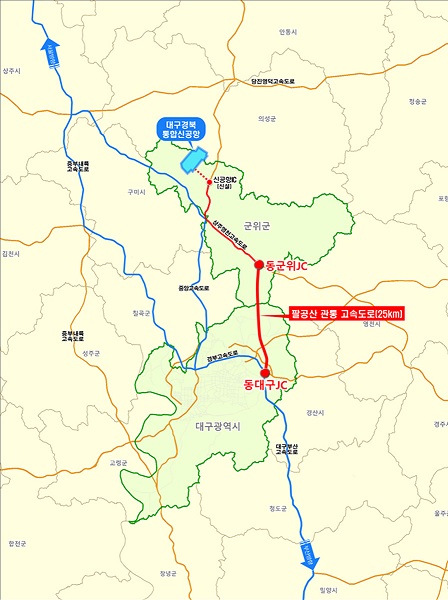 이번 팔공산 관통 고속도로는 동대구JC ~ 동군위JC를 25.3km를 연장해 사업비 1조 7천억 원을 들여 신공항 개항 시기에 맞춰 2030년 개통을 목표로 추진한다.