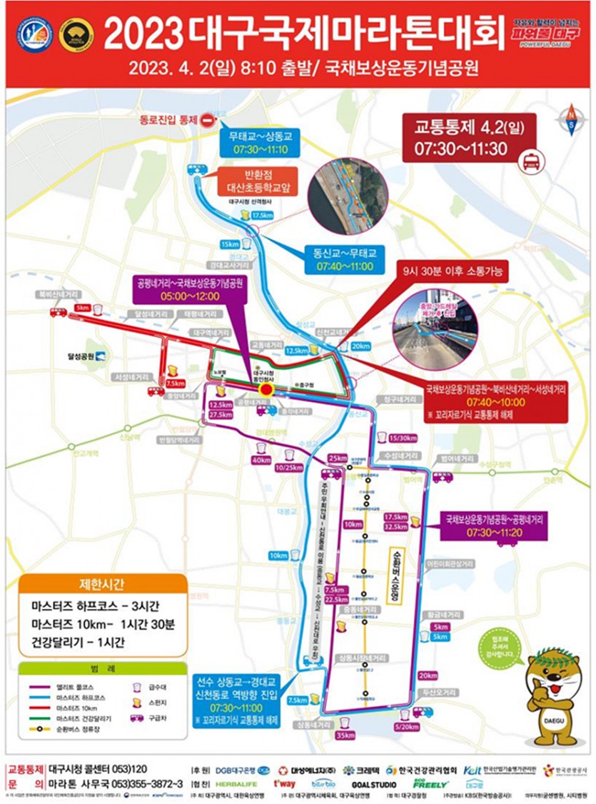 출발지인 국채보상기념공원 일대 교통통제는 새벽 5시부터 시작되고 마라톤 코스는 7시 30분부터 종목에 따라 시차를 두고 순차적으로 11시 50분까지 구간별로 이뤼진다.