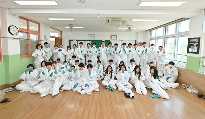 학생 75명과 교직원 22명이 참여해 방사능 대피 행동요령 교육, 경보 발령 시 대피, 방호복 착용 실습, 지정 구호소 이동 등 실제 상황을 가정한 훈련을 실시했다.
