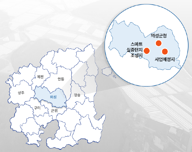 특시 의성 사곡면 일대 82ha의 생산단지에 자동 관수시설, 무인농기계, 드론 등 첨단장비를 도입하고, 노지작물 스마트화를 위해 필요한 농기계, 시설장비, 재배기술을 기업체, 연구기관 등에서 직접 시험할 수 있는 실증단지를 조성해 시범단지의 영농 관련 각종 정보를 수집․분석해 통합플랫폼도 설치할 예정이다.